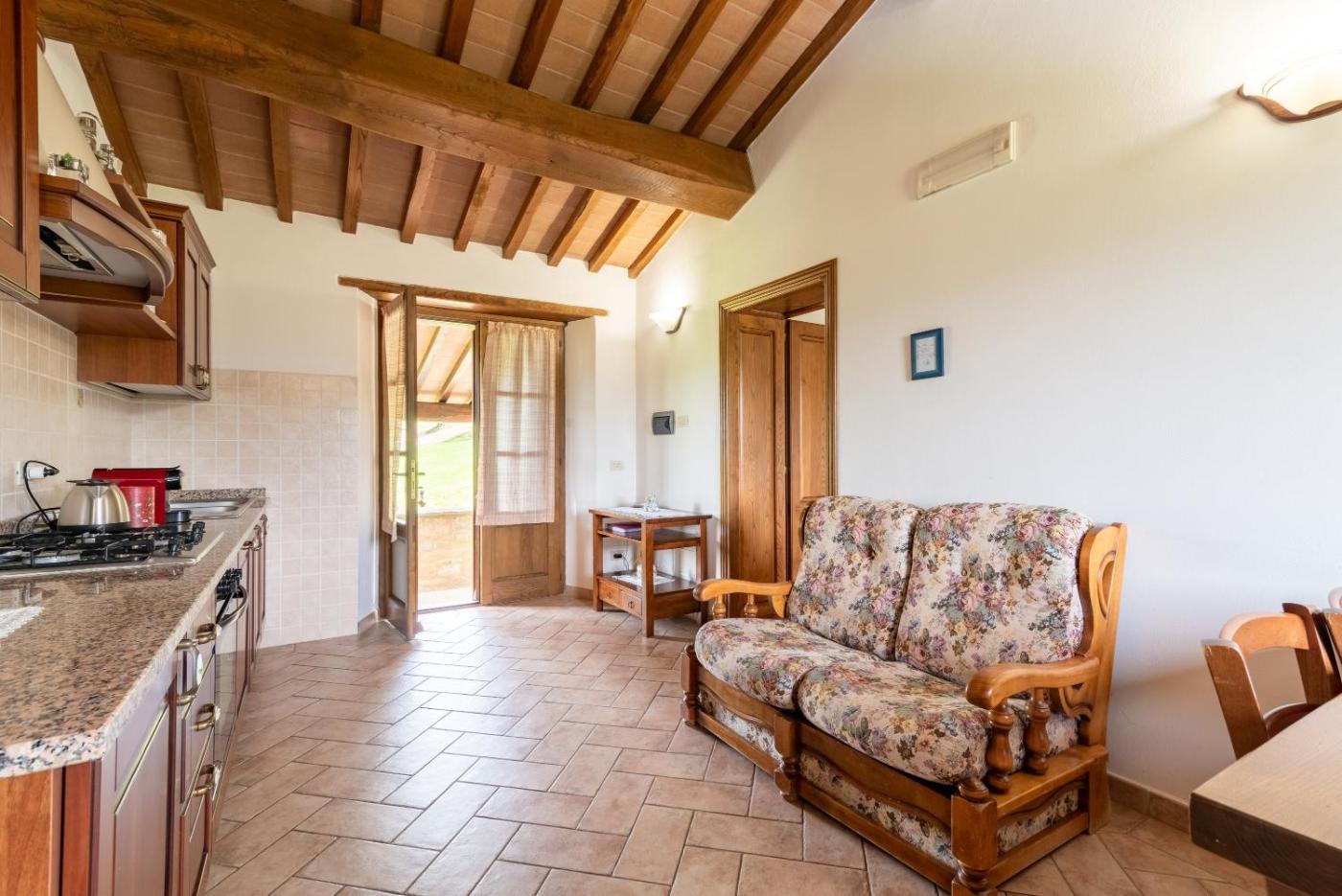 Questo agriturismo ha 2 camere da letto, 2 bagni, lenzuola, asciugamani, una TV, una cucina con utensili e un patio con la vista sul giardino.